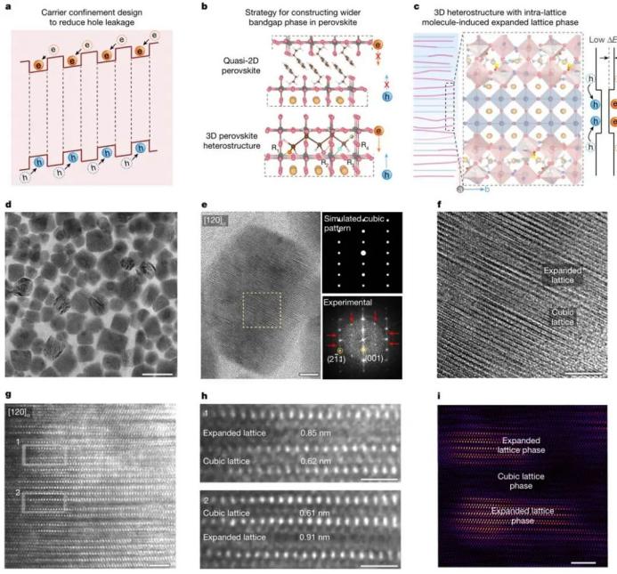 针对此问题,团队成员利用自主发明的EETA技术给CsPbI3-xBrx基LED“拍片子”,发现空穴泄漏到电子传输层是三维CsPbI3-xBrx基LED的性能瓶颈。EETA结果指出更好地限域空穴、抑制其泄漏是实现高性能CsPbI3-xBrx基纯红LED的关键。为了提升钙钛矿的载流子限域能力,团队提出一种全新的三维钙钛矿异质结设计,该异质结材料内部存在窄带隙发光体和限域载流子的宽带隙能垒。其中宽带隙材料是通过在部分CsPbI3-xBrx晶格中插入与铅卤骨架作用力强、空间位阻低的有机分子,从而引发部分晶格膨胀而实现的(图2a,b)。通过系统的理论计算与分子设计,成功开发出通过羧基、氨基和磺酰基等多功能基团与铅卤骨架形成稳定结合的有机分子,并实现宽带隙相的精准引入(图2c)。通过此方法,团队得到含有异质结构且三维骨架连续的钙钛矿材料,在实现载流子限域的同时保持高迁移率。所获得的三维钙钛矿异质结构被高分辨透射电镜充分验证(图2d-i)。