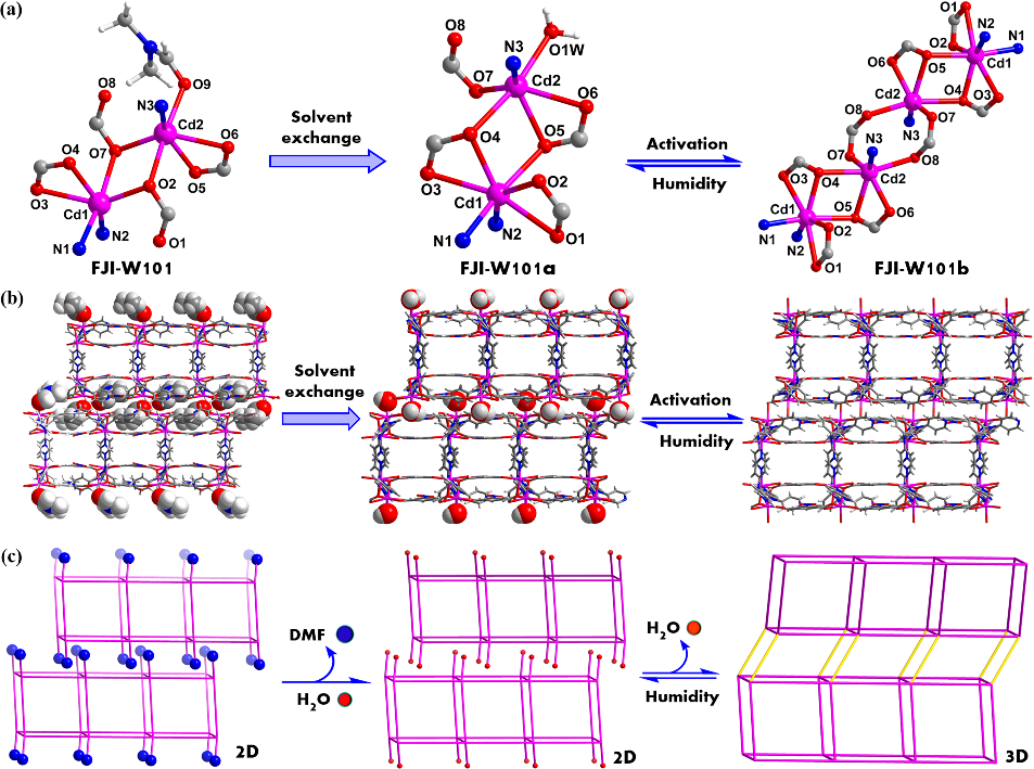 同时,FJI-W101a与FJI-W101b具有良好的结晶性,可以通过单晶X射线衍射分析捕获在孔道中的客体分子结构,精确地揭示孔道结构对C2H6和C3H8分子的选择性吸附作用。这项工作为开发具有可逆水缓冲性能的新型多孔气体分离材料提供了新思路。
