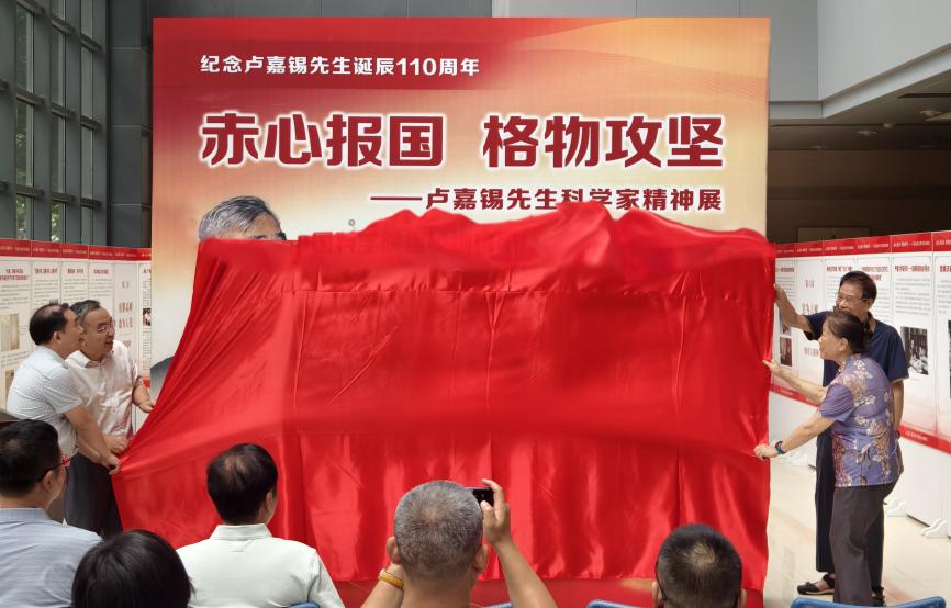在全体与会者的注目下,曹荣所长、张健书记与卢嘉锡先生亲属代表卢葛覃老师、曾瑞荣老师一同走上前台,共同为“赤心报国 格物攻坚—卢嘉锡先生科学家精神展”缓缓揭幕,宣告展览正式启动。